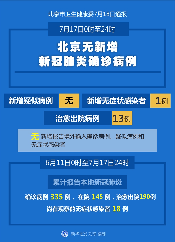 6月11日0時至7月17日24時,北京市累計報告本地新冠肺炎確診病例335例,在院145例,治愈出院190例,尚在觀察的無癥狀感染者18例。
