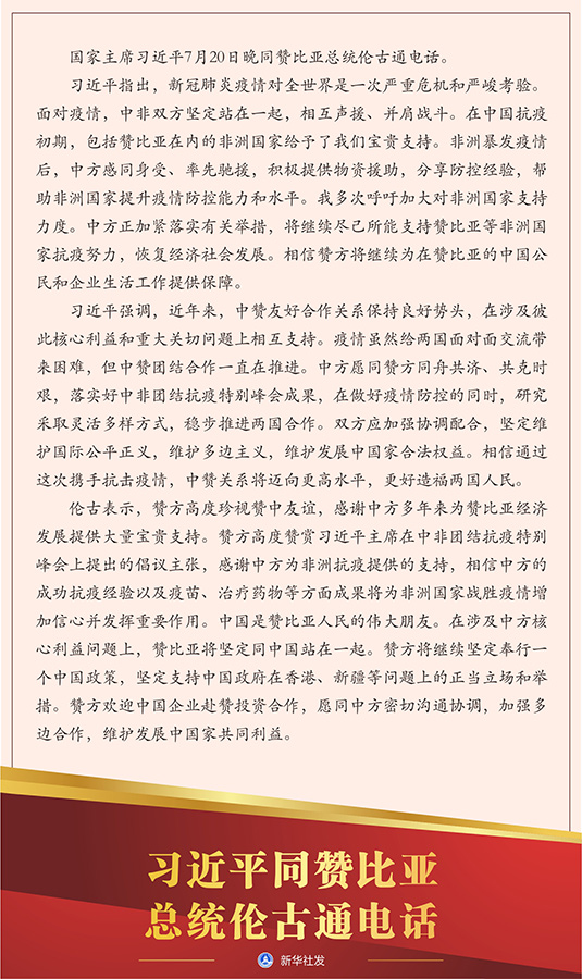 習(xí)近平強調(diào),近年來,中贊友好合作關(guān)系保持良好勢頭,在涉及彼此核心利益和重大關(guān)切問題上相互支持。疫情雖然給兩國面對面交流帶來困難,但中贊團結(jié)合作一直在推進。中方愿同贊方同舟共濟、共克時艱,落實好中非團結(jié)抗疫特別峰會成果,在做好疫情防控的同時,研究采取靈活多樣方式,穩(wěn)步推進兩國合作。雙方應(yīng)加強協(xié)調(diào)配合,堅定維護國際公平正義,維護多邊主義,維護發(fā)展中國家合法權(quán)益。相信通過這次攜手抗擊疫情,中贊關(guān)系將邁向更高水平,更好造福兩國人民。