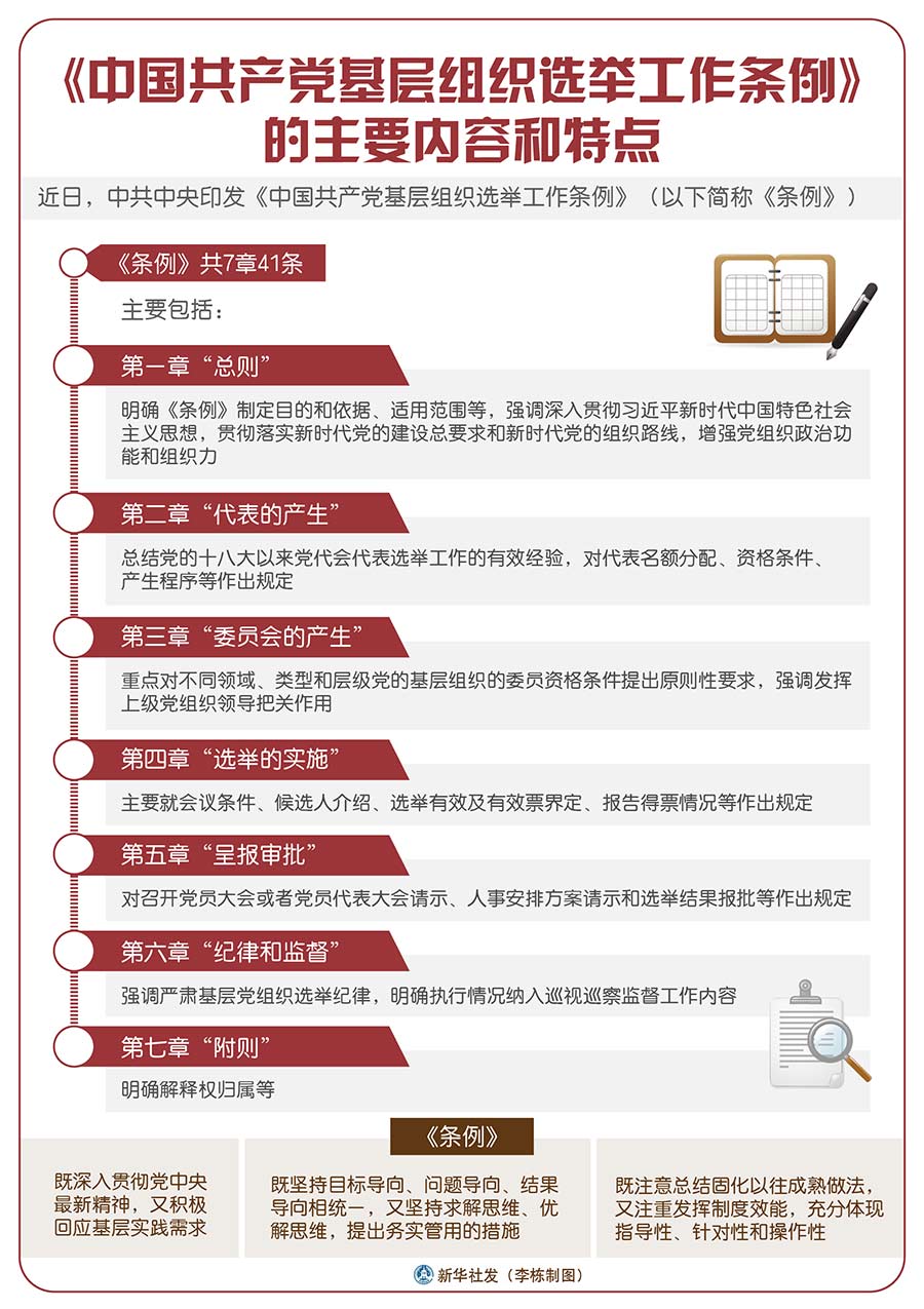 答:《條例》共7章41條,主要包括:第一章“總則”,明確《條例》制定目的和依據(jù)、適用范圍等,強調(diào)深入貫徹習(xí)近平新時代中國特色社會主義思想,貫徹落實新時代黨的建設(shè)總要求和新時代黨的組織路線,增強黨組織政治功能和組織力。第二章“代表的產(chǎn)生”,總結(jié)黨的十八大以來黨代會代表選舉工作的有效經(jīng)驗,對代表名額分配、資格條件、產(chǎn)生程序等作出規(guī)定。第三章“委員會的產(chǎn)生”,重點對不同領(lǐng)域、類型和層級黨的基層組織的委員資格條件提出原則性要求,強調(diào)發(fā)揮上級黨組織領(lǐng)導(dǎo)把關(guān)作用。第四章“選舉的實施”,主要就會議條件、候選人介紹、選舉有效及有效票界定、報告得票情況等作出規(guī)定。第五章“呈報審批”,對召開黨員大會或者黨員代表大會請示、人事安排方案請示和選舉結(jié)果報批等作出規(guī)定。第六章“紀律和監(jiān)督”,強調(diào)嚴肅基層黨組織選舉紀律,明確執(zhí)行情況納入巡視巡察監(jiān)督工作內(nèi)容。第七章“附則”,明確解釋權(quán)歸屬等。