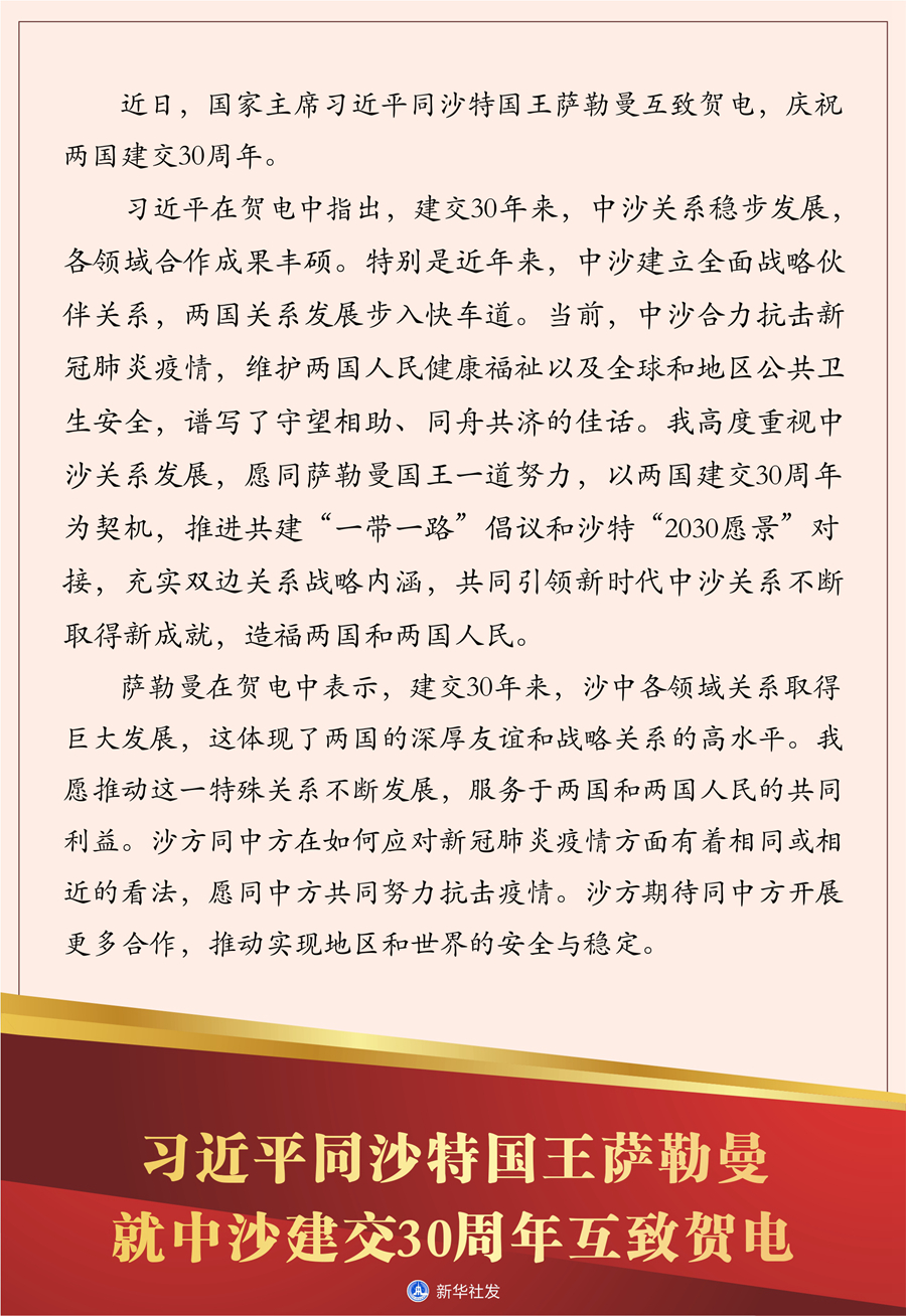 習(xí)近平在賀電中指出,建交30年來(lái),中沙關(guān)系穩(wěn)步發(fā)展,各領(lǐng)域合作成果豐碩。特別是近年來(lái),中沙建立全面戰(zhàn)略伙伴關(guān)系,兩國(guó)關(guān)系發(fā)展步入快車道。當(dāng)前,中沙合力抗擊新冠肺炎疫情,維護(hù)兩國(guó)人民健康福祉以及全球和地區(qū)公共衛(wèi)生安全,譜寫了守望相助、同舟共濟(jì)的佳話。我高度重視中沙關(guān)系發(fā)展,愿同薩勒曼國(guó)王一道努力,以兩國(guó)建交30周年為契機(jī),推進(jìn)共建“一帶一路”倡議和沙特“2030愿景”對(duì)接,充實(shí)雙邊關(guān)系戰(zhàn)略內(nèi)涵,共同引領(lǐng)新時(shí)代中沙關(guān)系不斷取得新成就,造福兩國(guó)和兩國(guó)人民。