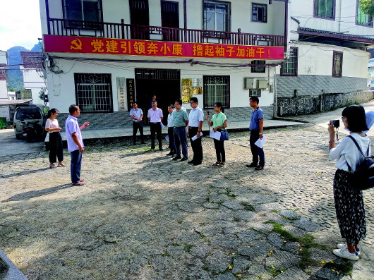 7月30日,韋煥能(左二)向前來合寨村調(diào)研的人士介紹合寨村村民自治情況。黃建峰攝