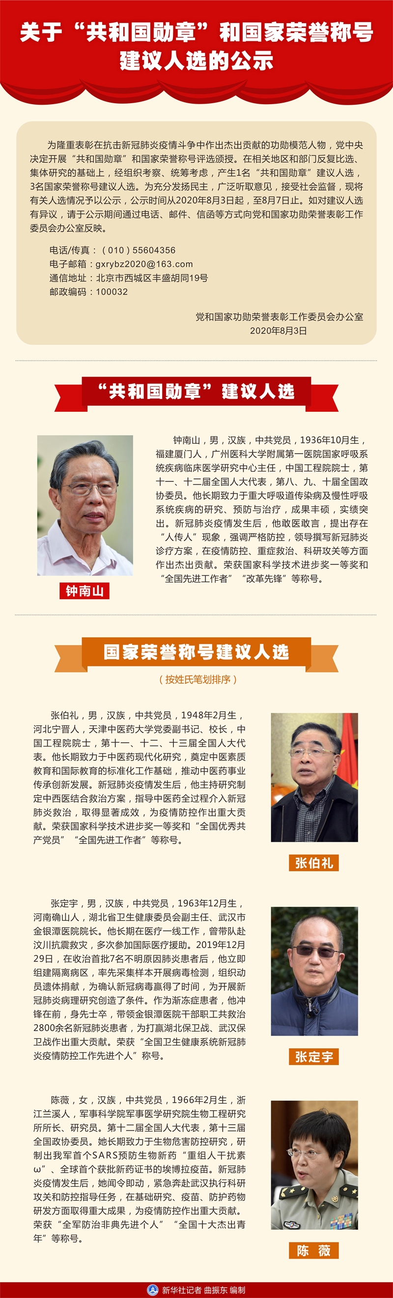 為隆重表彰在抗擊新冠肺炎疫情斗爭中作出杰出貢獻的功勛模范人物,黨中央決定開展“共和國勛章”和國家榮譽稱號評選頒授。在相關地區(qū)和部門反復比選、集體研究的基礎上,經組織考察、統籌考慮,產生1名“共和國勛章”建議人選,3名國家榮譽稱號建議人選。為充分發(fā)揚民主,廣泛聽取意見,接受社會監(jiān)督,現將有關人選情況予以公示,公示時間從2020年8月3日起,至8月7日止。如對建議人選有異議,請于公示期間通過電話、郵件、信函等方式向黨和國家功勛榮譽表彰工作委員會辦公室反映。