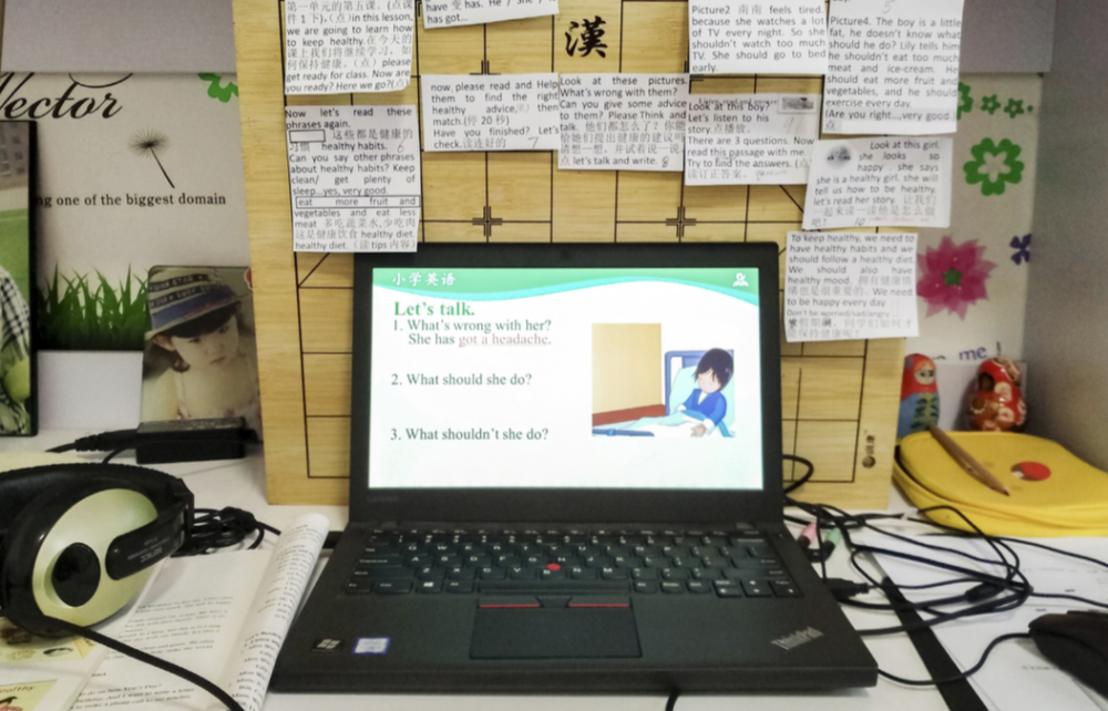 2月17日,北京中關(guān)村第三小學(xué)英語老師魯鳳玲在家中為學(xué)生錄制“國家中小學(xué)網(wǎng)絡(luò)云平臺(tái)”教學(xué)內(nèi)容,電腦附近貼滿了用來提詞的紙條
