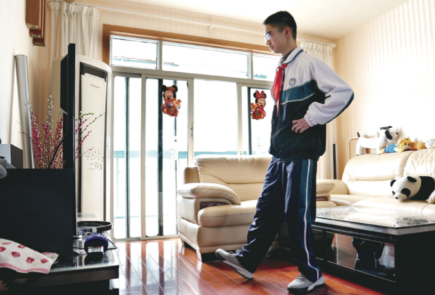 3月2日,上海市三門(mén)中學(xué)初二學(xué)生孫旭涵跟隨在線教育體育課老師學(xué)習(xí)居家健身操(劉穎 / 攝)