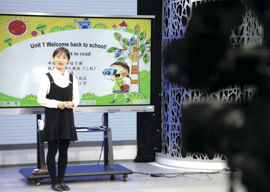 2月17日,寧夏銀川市金鳳區(qū)實(shí)驗(yàn)小學(xué)教師楊玉燕在錄制“空中課堂”四年級(jí)英語課程(楊植森/攝)