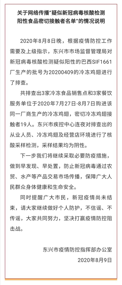 8月9日,記者從東興市疫情防控指揮部辦公室了解到, 8月8日晚,根據(jù)疫情防控工作需要及上級指示,東興市市場監(jiān)督管理局對新冠病毒核酸檢測疑似陽性的巴西SIF1661廠生產(chǎn)的批號為20200409的冷凍雞翅進(jìn)行了排查,共排查出3家冷凍食品銷售點(diǎn)和3家餐飲服務(wù)單位于2020年7月27日—8月7日購進(jìn)該同一廠商生產(chǎn)的冷凍雞翅,密切冷凍雞翅接觸者19人。東興市疾控中心連夜對排查出的從業(yè)人員、冷凍雞翅及經(jīng)營店環(huán)境進(jìn)行了核酸采樣檢測,采樣結(jié)果均為陰性。