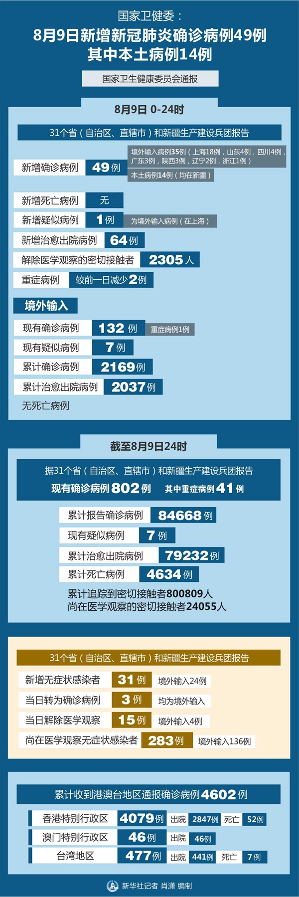 新華社北京8月10日電 國(guó)家衛(wèi)生健康委員會(huì)10日通報(bào),8月9日0-24時(shí),31個(gè)?。ㄗ灾螀^(qū)、直轄市)和新疆生產(chǎn)建設(shè)兵團(tuán)報(bào)告新增新冠肺炎確診病例49例,其中境外輸入病例35例(上海18例,山東4例,四川4例,廣東3例,陜西3例,遼寧2例,浙江1例),本土病例14例(均在新疆);無(wú)新增死亡病例;新增疑似病例1例,為境外輸入病例(在上海)。