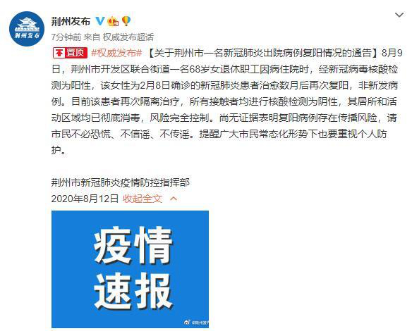 據(jù)湖北省荊州市新冠肺炎疫情防控指揮部12日通報(bào),8月9日,荊州市開發(fā)區(qū)聯(lián)合街道一名68歲女退休職工因病住院時(shí),經(jīng)新冠病毒核酸檢測(cè)為陽性,該女性為2月8日確診的新冠肺炎患者治愈數(shù)月后再次復(fù)陽,非新發(fā)病例。目前該患者再次隔離治療,所有接觸者均進(jìn)行核酸檢測(cè)為陰性,其居所和活動(dòng)區(qū)域均已徹底消毒,風(fēng)險(xiǎn)完全控制。尚無證據(jù)表明復(fù)陽病例存在傳播風(fēng)險(xiǎn),請(qǐng)市民不必恐慌、不信謠、不傳謠。提醒廣大市民常態(tài)化形勢(shì)下也要重視個(gè)人防護(hù)。