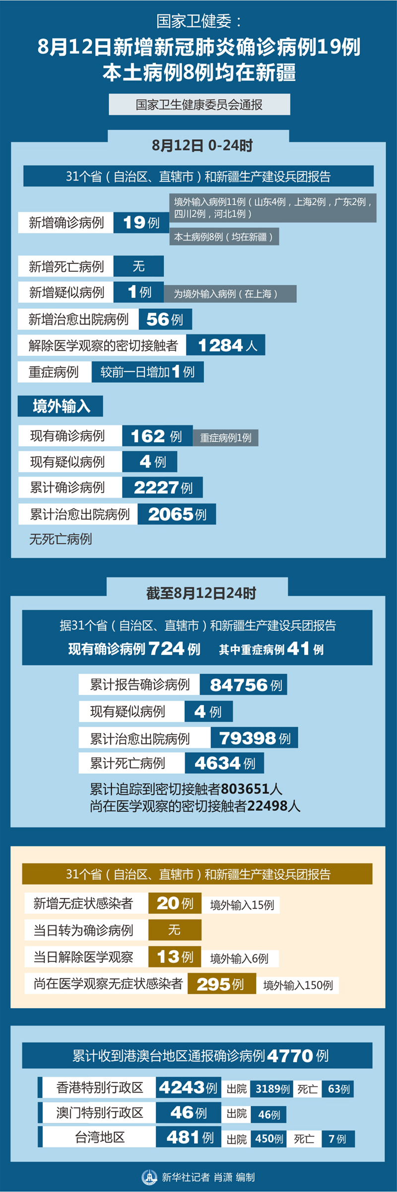 截至8月12日24時,據(jù)31個?。ㄗ灾螀^(qū)、直轄市)和新疆生產建設兵團報告,現(xiàn)有確診病例724例(其中重癥病例41例),累計治愈出院病例79398例,累計死亡病例4634例,累計報告確診病例84756例,現(xiàn)有疑似病例4例。累計追蹤到密切接觸者803651人,尚在醫(yī)學觀察的密切接觸者22498人。