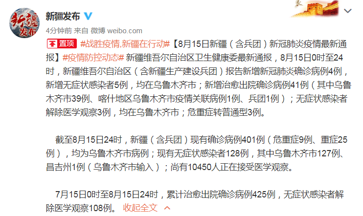 新疆維吾爾自治區(qū)衛(wèi)生健康委最新通報,8月15日0時至24時,新疆維吾爾自治區(qū)(含新疆生產(chǎn)建設兵團)報告新增新冠肺炎確診病例4例,新增無癥狀感染者5例,均在烏魯木齊市;新增治愈出院確診病例41例(其中烏魯木齊市39例、喀什地區(qū)烏魯木齊市疫情關聯(lián)病例1例、兵團1例);無癥狀感染者解除醫(yī)學觀察3例,均在烏魯木齊市;危重癥轉普通型3例。