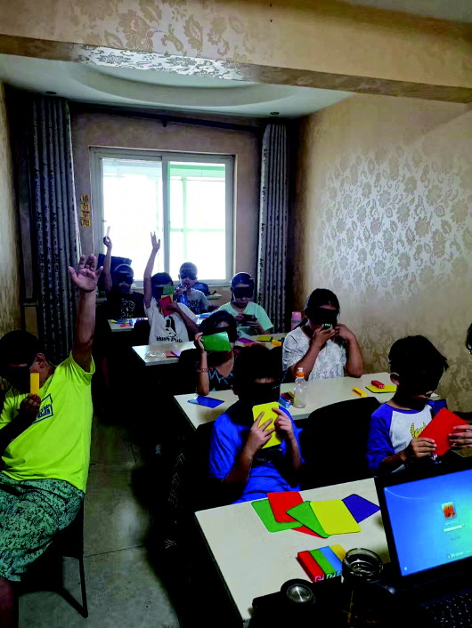 某培訓機構讓孩子蒙著眼睛感知顏色。 本報記者王菲菲攝