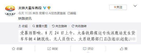 據(jù)大秦車務(wù)段官方微博消息,受暴雨影響,8月24日上午,大秦鐵路煤運(yùn)專線涿鹿站發(fā)生貨車車輛4輛脫線,無人員傷亡,太原鐵路部門正在組織修復(fù)。