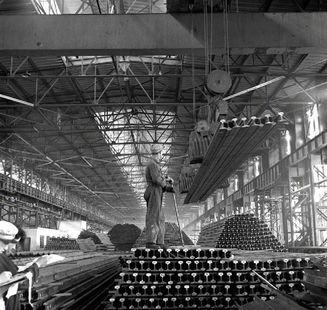 ?“一五”期間,鞍鋼興建的第一座大型軋鋼廠生產(chǎn)能力已迅速超過設(shè)計標準。這是這個廠生產(chǎn)的大批鋼軌(攝于1957年4月)。 ?