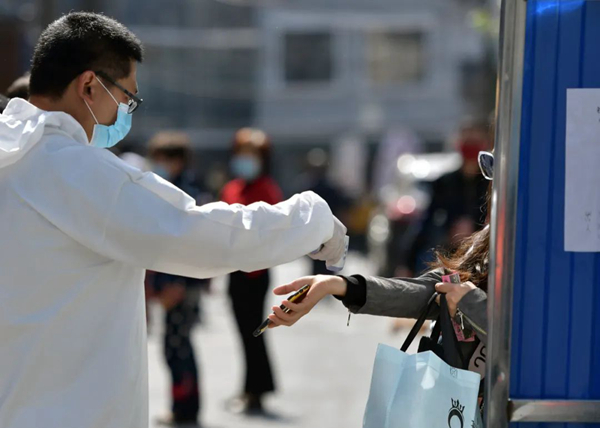 在武漢市武昌楚材社區(qū),工作人員為出入者測體溫