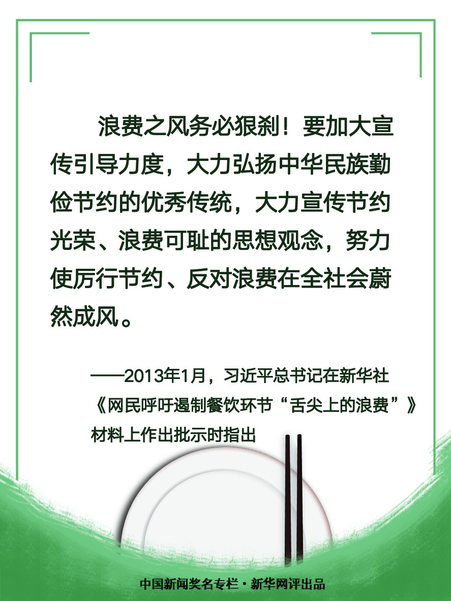 民以食為天,食以儉養(yǎng)德。餐飲浪費(fèi)現(xiàn)象存在著巨大危害,全社會必須深刻認(rèn)識勤儉節(jié)約的重要性。當(dāng)務(wù)之急,各地各部門、各餐飲機(jī)構(gòu)、每個人都要行動起來,采取加強(qiáng)立法、強(qiáng)化監(jiān)管、加強(qiáng)宣傳教育等舉措,從我做起,從小事做起,進(jìn)一步營造勤儉節(jié)約之風(fēng)。(文字:馬若虎 海報:張倩)