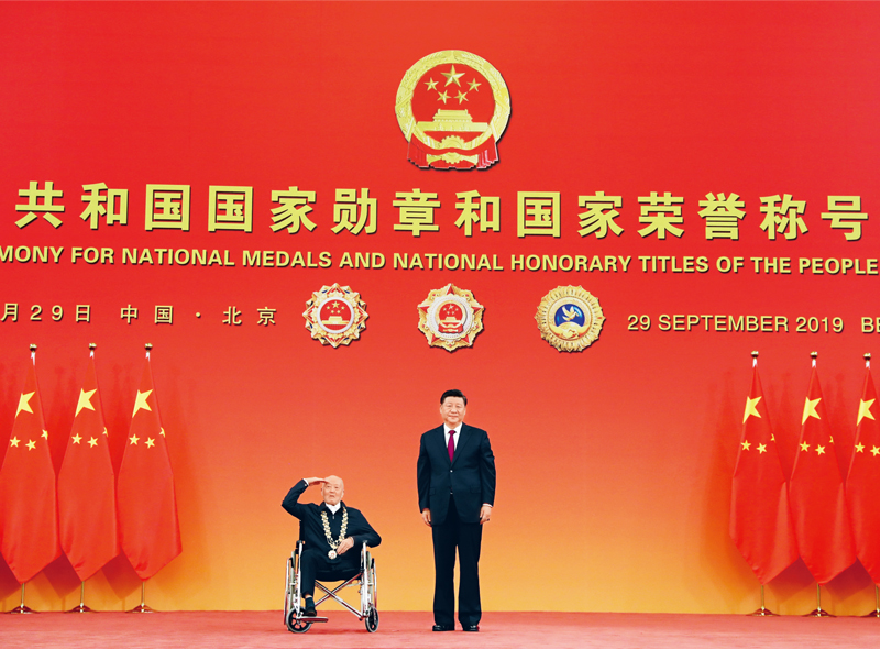 2019年9月29日,中華人民共和國國家勛章和國家榮譽(yù)稱號頒授儀式在北京人民大會(huì)堂金色大廳隆重舉行。中共中央總書記、國家主席、中央軍委主席習(xí)近平向“共和國勛章”獲得者張富清頒授勛章。 新華社記者 王曄/攝