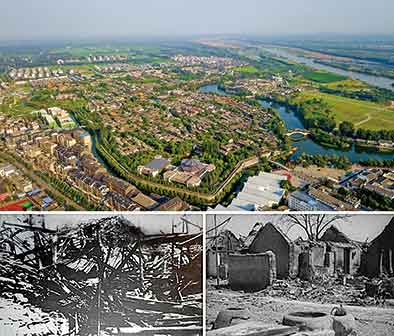拼版照片:上圖為8月17日無(wú)人機(jī)航拍臺(tái)兒莊古城全貌(新華社記者郭緒雷攝);下兩圖為1938年臺(tái)兒莊大戰(zhàn)后古城廢墟(資料照片)。