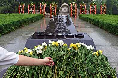 在臺(tái)兒莊無(wú)名烈士墓前,一位青年獻(xiàn)花(8月15日攝)。新華社記者郭緒雷攝