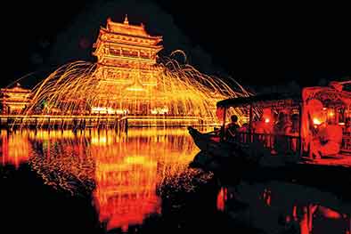 在臺(tái)兒莊古城,游客坐在船上觀看打鋼花非遺表演(8月20日攝)。新華社記者郭緒雷攝