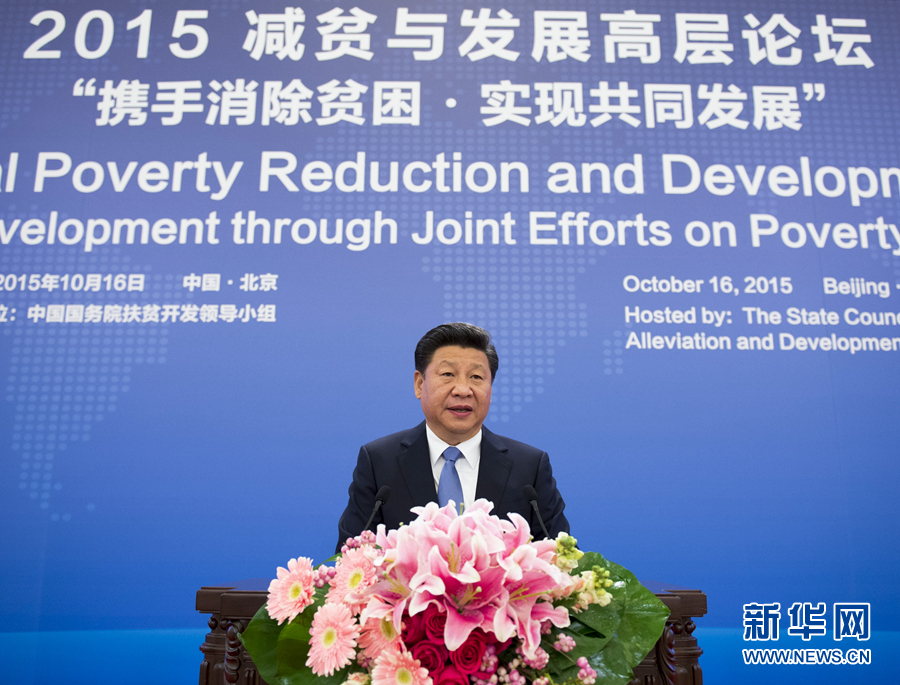 2015年10月16日,習(xí)近平在北京出席2015減貧與發(fā)展高層論壇并發(fā)表題為《攜手消除貧困 促進(jìn)共同發(fā)展》的主旨演講,強(qiáng)調(diào)消除貧困是人類(lèi)的共同使命。改革開(kāi)放30多年來(lái),中國(guó)走出了一條中國(guó)特色減貧道路。中國(guó)在致力于自身消除貧困的同時(shí),積極展開(kāi)南南合作,同舟共濟(jì),攻堅(jiān)克難,支持和幫助廣大發(fā)展中國(guó)家特別是最不發(fā)達(dá)國(guó)家消除貧困,為各國(guó)人民帶來(lái)更多福祉。 新華社記者 李學(xué)仁 攝