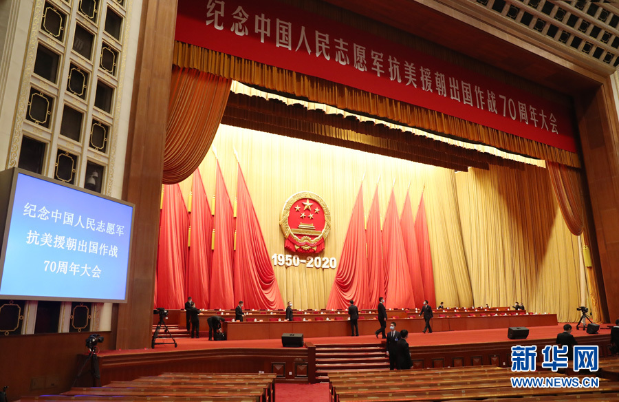 ??? 10月23日,紀念中國人民志愿軍抗美援朝出國作戰(zhàn)70周年大會在北京人民大會堂隆重舉行。圖為人民大會堂大禮堂。(新華網(wǎng) 翟子赫 攝)