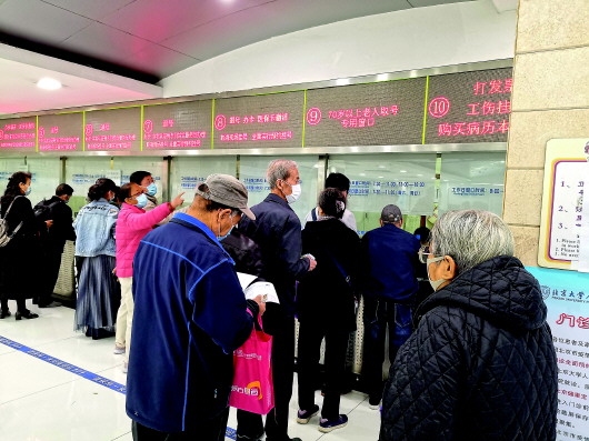 此時,這家醫(yī)院唯一一個現(xiàn)場掛號的窗口——面向70周歲以上老年人的窗口,已經排起了長隊。老人們一個比一個來得早,仍有點兒神色緊張。