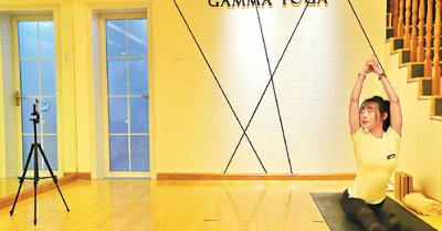 位于河北省秦皇島市海港區(qū)的一家瑜伽會所內(nèi),瑜伽教練正在通過直播的方式為學(xué)員講解課程。曹建雄攝(人民視覺)