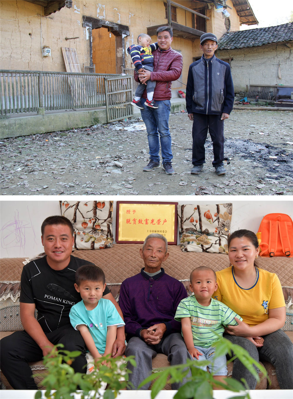 拼版照片的上圖:在江西省修水縣上奉鎮(zhèn)麻洞村的舊屋前,村民胡尚海抱著兒子和父親一起合影(2017年11月攝,資料照片)。