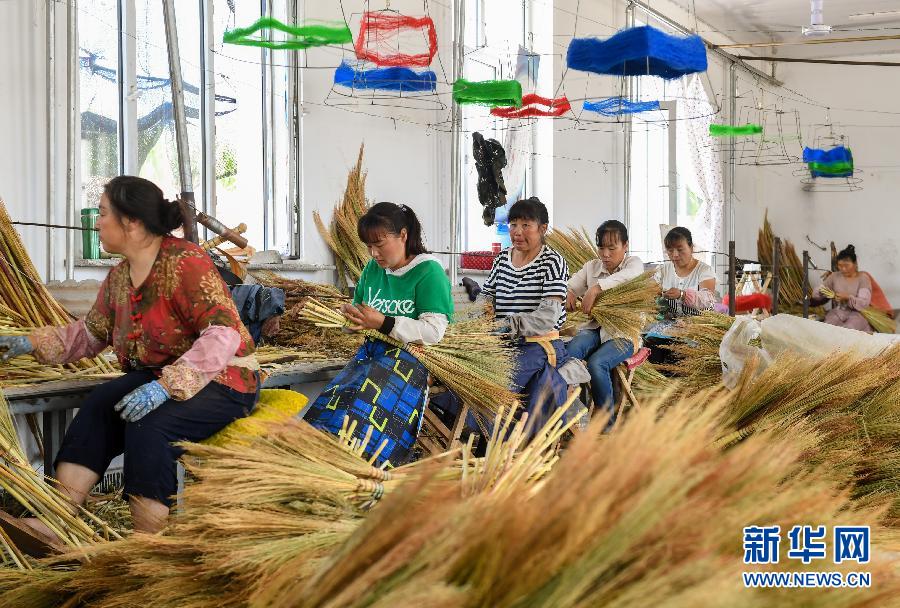貧困戶在巴林左旗林東鎮(zhèn)扶貧車間內(nèi)制作笤帚(2019年8月5日攝)。新華社記者 彭源 攝