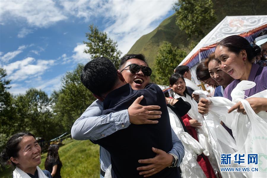 在西藏拉薩市達(dá)孜區(qū),北京大學(xué)腫瘤醫(yī)院的援藏醫(yī)生袁燦(帶墨鏡者)與送別的藏族同事?lián)肀В?月1日攝)。新華社記者 彭子洋 攝