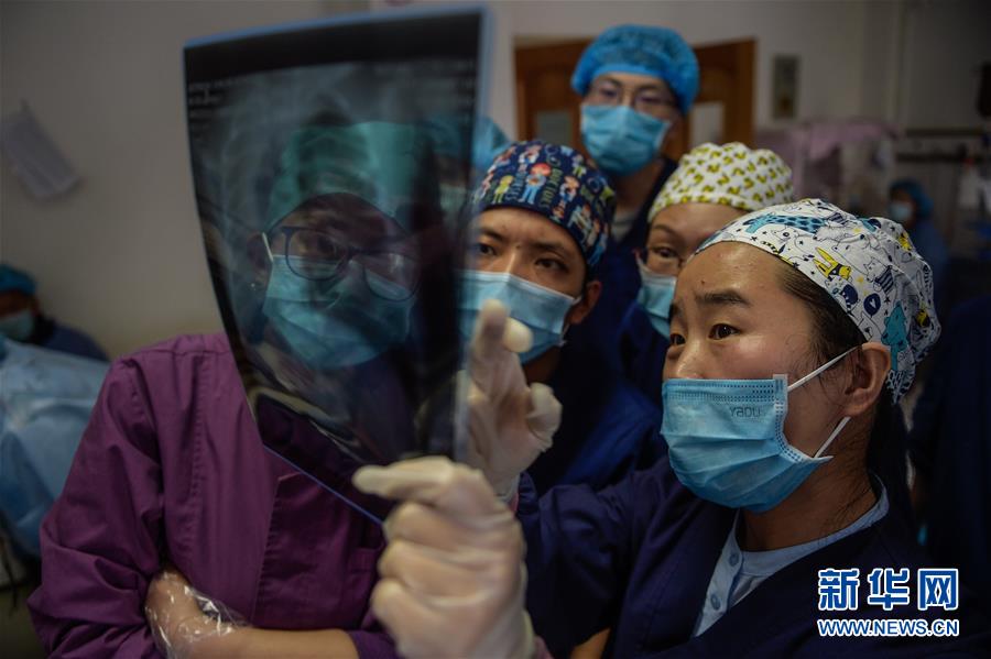 在西藏拉薩市人民醫(yī)院內(nèi),首都兒科研究所的援藏醫(yī)生韓同英(右一)進(jìn)行教學(xué)查房時(shí),與徒弟們一起研究入院新生兒胸片(8月3日攝)。新華社記者 彭子洋 攝