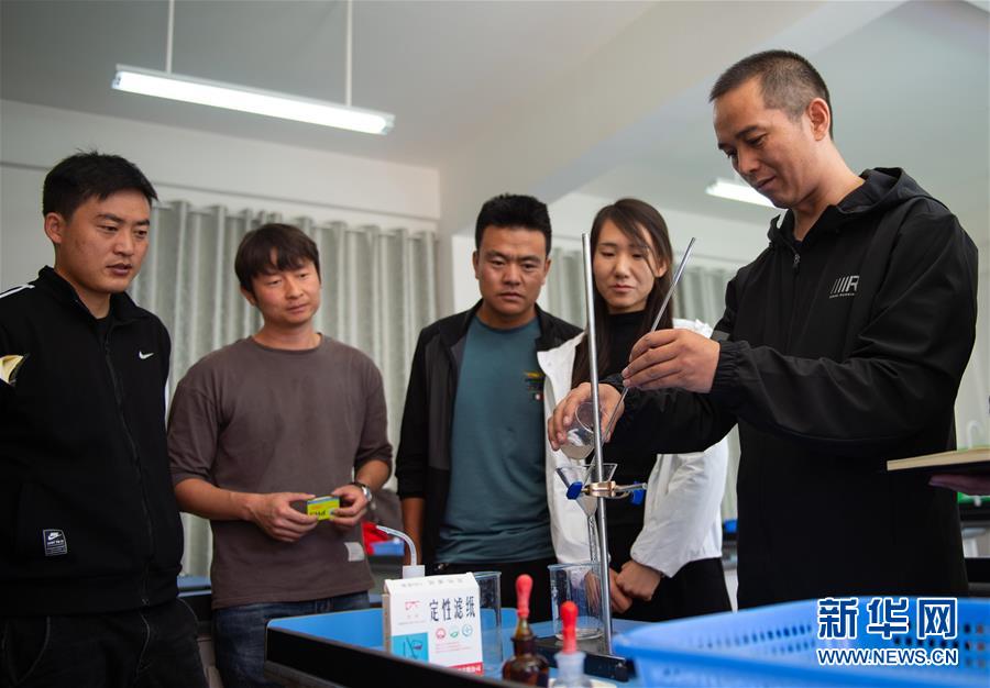 北京市援青支教教師、來自通州區(qū)陸辛莊學(xué)校的化學(xué)教師祁生貴(右一)在青海省玉樹州第四民族高級(jí)中學(xué)指導(dǎo)學(xué)校教師進(jìn)行實(shí)驗(yàn)教學(xué)(8月12日攝)。新華社記者 陳鐘昊 攝