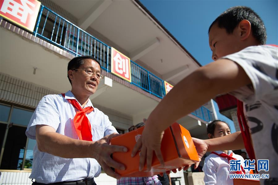 北京市西城區(qū)陶然亭小學(xué)退休老校長(zhǎng)劉建文(左)在他支教的河北省阜平縣半溝小學(xué)開學(xué)典禮上給學(xué)生贈(zèng)送學(xué)習(xí)用品(9月3日攝)。新華社記者 陳鐘昊 攝