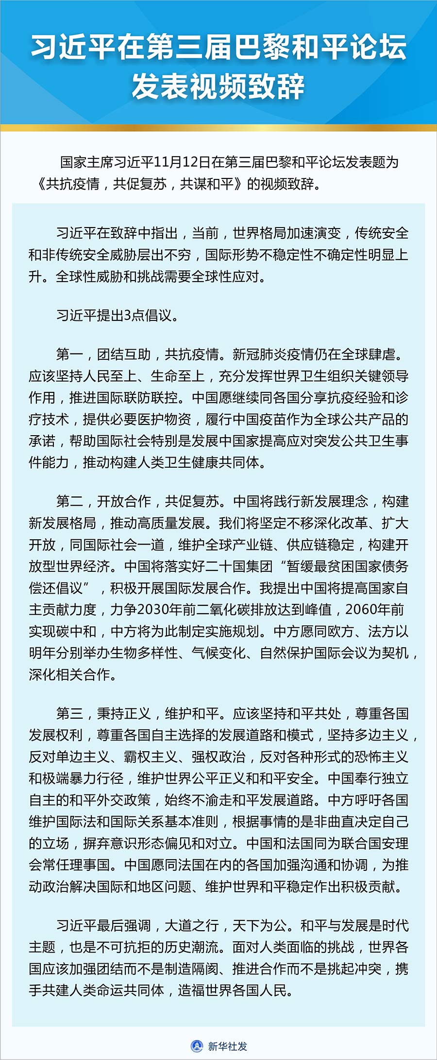 新華社北京11月12日電 國家主席習近平12日在第三屆巴黎和平論壇發(fā)表題為《共抗疫情,共促復蘇,共謀和平》的視頻致辭。