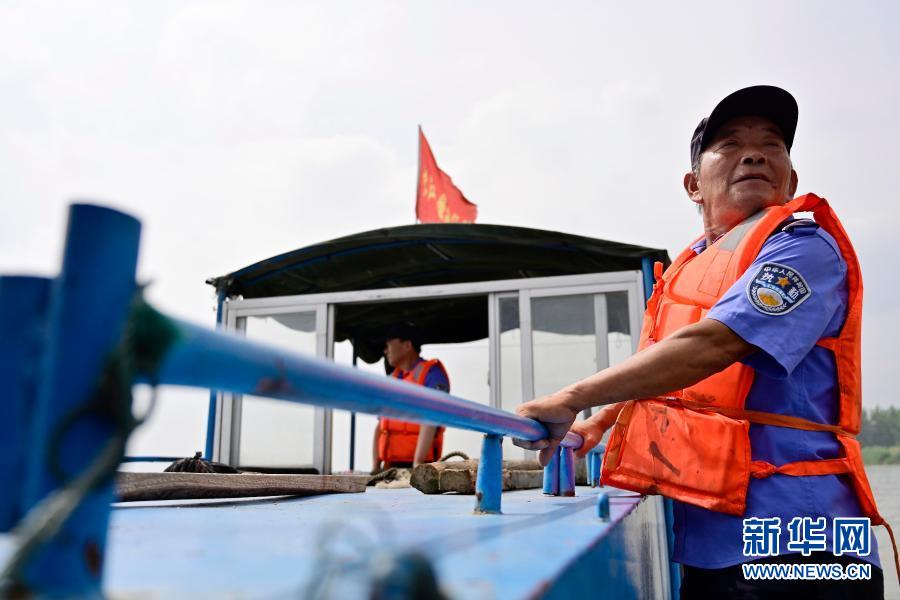 在江西省湖口縣,江豚協(xié)助巡護(hù)隊(duì)的隊(duì)員伍后春在觀察水面是否有違法捕撈的工具。他和他的父親、爺爺三代在鄱陽(yáng)湖和長(zhǎng)江捕魚(yú)為生,2017年開(kāi)始上岸,目前已成為巡護(hù)隊(duì)隊(duì)員(6月8日攝)。新華社記者 彭昭之 攝