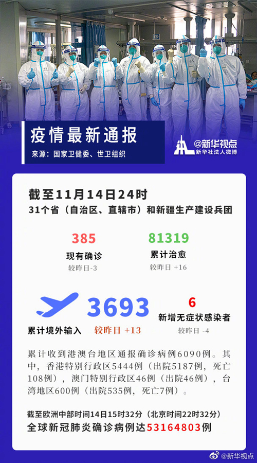 截至11月14日24時,據(jù)31個?。ㄗ灾螀^(qū)、直轄市)和新疆生產(chǎn)建設兵團報告,現(xiàn)有確診病例385例(其中重癥病例4例),累計治愈出院病例81319例,累計死亡病例4634例,累計報告確診病例86338例,現(xiàn)有疑似病例2例。累計追蹤到密切接觸者873191人,尚在醫(yī)學觀察的密切接觸者15032人。