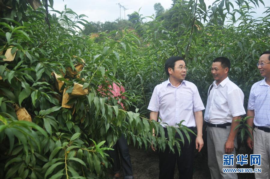2011年7月,黃詩燕(右三)在霞陽鎮(zhèn)考察黃桃種植業(yè)。新華社發(fā)