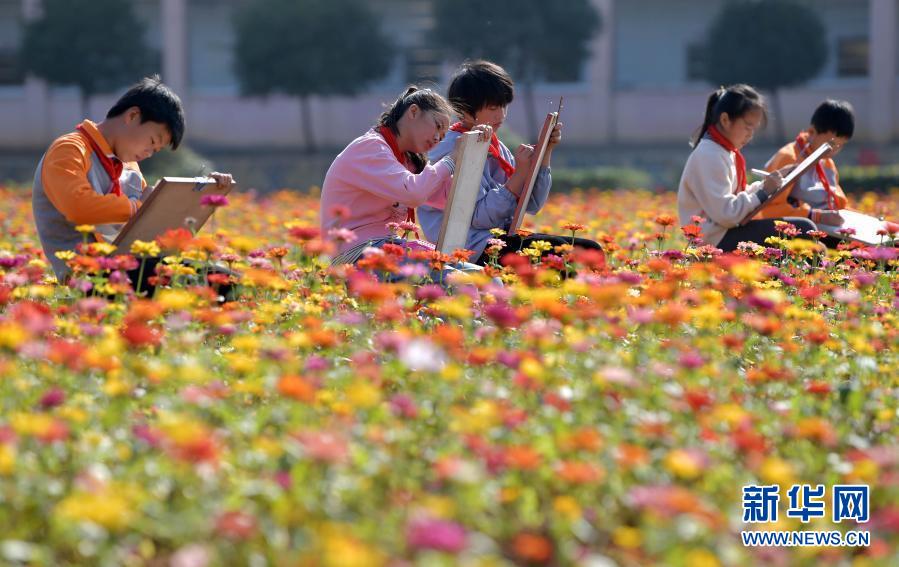 江西省宜春市袁州區(qū)寨下中心小學學生在花海上美術課(11月9日攝)。新華社記者 彭昭之 攝