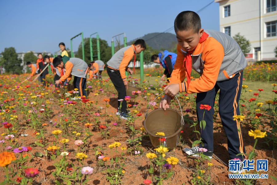 為了更好守護這片綠,師生一起加入“護花使者”隊伍,扛著鋤頭拎著桶,鋤草、松土、澆水……“師生們共同的汗水澆灌了這片花田,因此大家都很愛護它。”寨下中心小學教師易夢晗說,種花能幫助學生了解植物的生長過程,還能提高他們的動手能力。