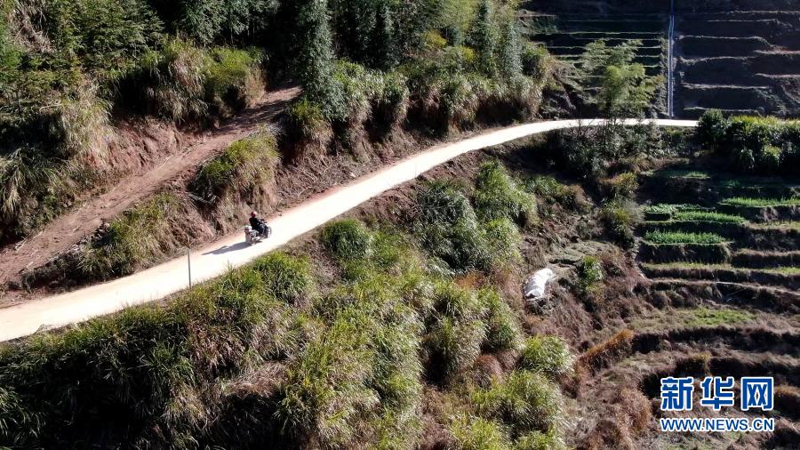 在江西省萬載縣高村鎮(zhèn)新竹村,新竹小學的校長羅長石騎行在山路上(2月17日攝,無人機照片)。他要去最偏遠的村組,給學生送當天的線上教學課程。新華社記者 彭昭之 攝