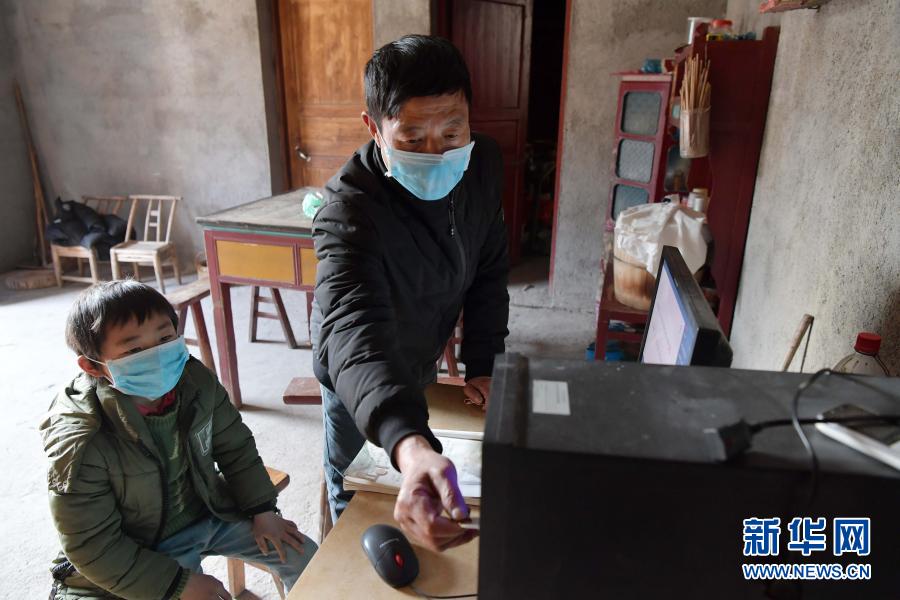 在江西省萬載縣高村鎮(zhèn)新竹村新竹小學,校長羅長石邊播邊錄當天的線上教育課程(2月17日攝)。新華社記者 彭昭之 攝