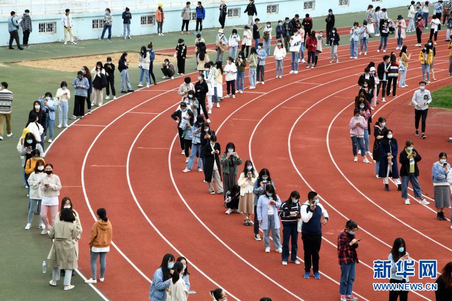 學(xué)生在青島大學(xué)體育場檢測點(diǎn)排隊(duì)等待核酸檢測采樣(10月13日攝)。新華社記者 李紫恒 攝