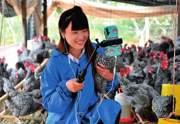 陜西省商洛市丹鳳縣寺坪鎮(zhèn)寺坪村村民李萌在自家雞棚里網(wǎng)絡(luò)直播賣(mài)貨(9月10日攝) 劉瀟攝