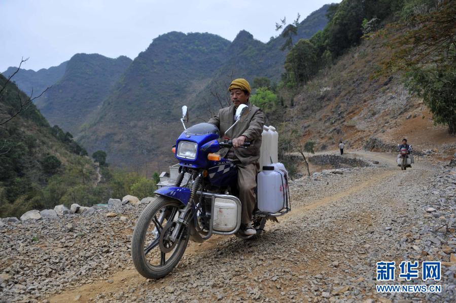 一名取水村民騎行在廣西巴馬瑤族自治縣東山鄉(xiāng)文錢(qián)村的山路上(2010年3月7日攝)。新華社記者 周華 攝