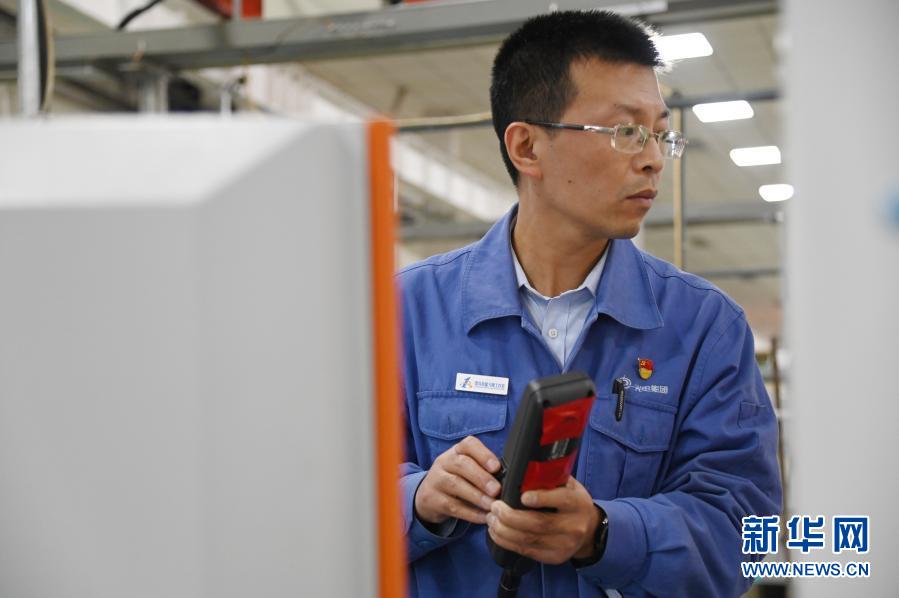 11月26日,在河南平原光電有限公司車間,梁兵通過搖手輪進(jìn)行刀具補(bǔ)償?shù)臏y量。新華社記者 張浩然 攝