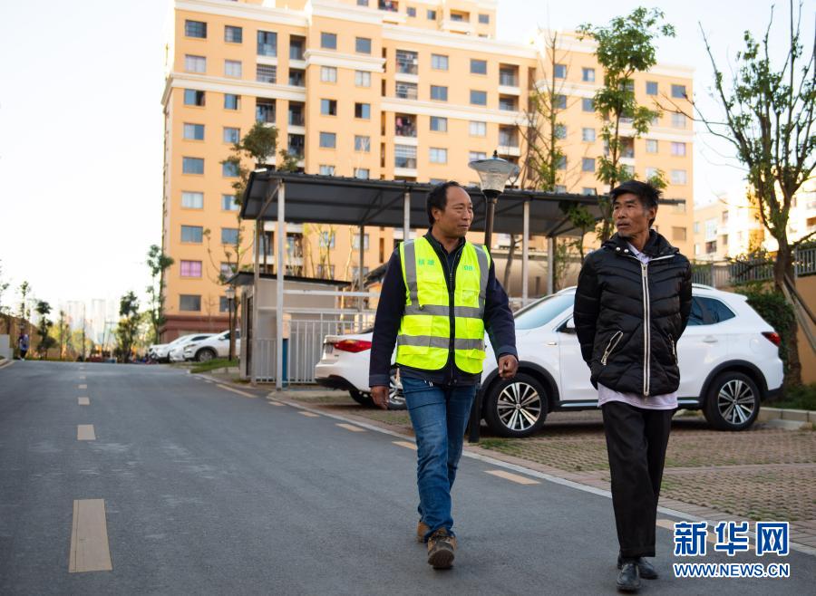 馮登友(左)在云南省鎮(zhèn)雄縣魯家院子易地扶貧搬遷安置點(diǎn)巡邏時(shí)與搬遷群眾聊天(11月10日攝)。新華社記者 王冠森 攝