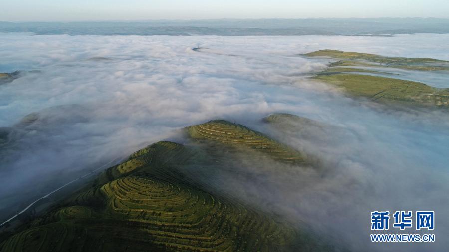 這是2018年7月17日拍攝的云霧繚繞的寧夏彭陽縣金雞坪梯田公園(無人機照片)。新華社記者 王鵬 攝