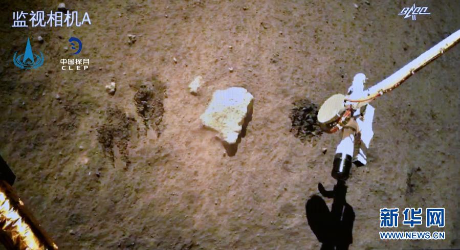 12月2日,嫦娥五號(hào)探測(cè)器在月球表面自動(dòng)采樣。新華社發(fā)(國(guó)家航天局供圖)