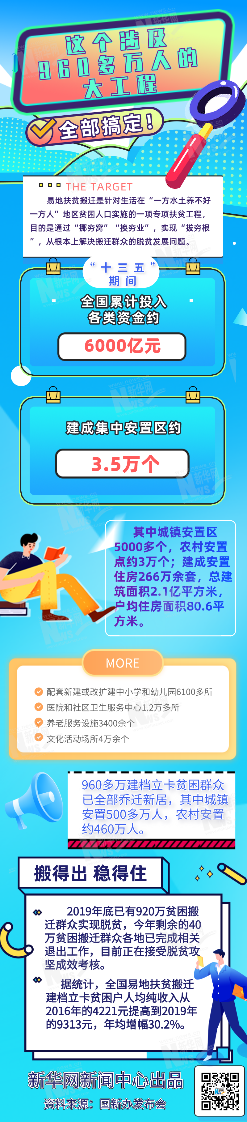 據(jù)了解,易地扶貧搬遷是針對生活在“一方水土養(yǎng)不好一方人”地區(qū)貧困人口實施的一項專項扶貧工程,目的是通過“挪窮窩”“換窮業(yè)”,實現(xiàn)“拔窮根”,從根本上解決搬遷群眾的脫貧發(fā)展問題。記者從發(fā)布會了解到,當前我國已建成城鎮(zhèn)安置區(qū)5000多個,農(nóng)村安置點約3萬個;建成安置住房266萬余套,總建筑面積2.1億平方米,戶均住房面積80.6平方米;配套新建或改擴建中小學和幼兒園6100多所、醫(yī)院和社區(qū)衛(wèi)生服務中心1.2萬多所、養(yǎng)老服務設施3400余個、文化活動場所4萬余個。