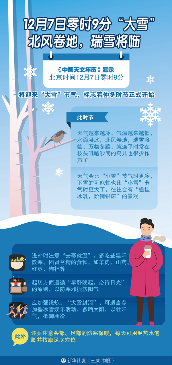 歷史學者、天津社科院研究員羅澍偉介紹,“大雪”是二十四節(jié)氣中的第二十一個節(jié)氣,也是冬季的第三個節(jié)氣。此時節(jié),天氣會比“小雪”節(jié)氣時更冷,下雪的可能性也比“小雪”節(jié)氣時更大了,往往會有“檐掛冰乳,階鋪銀床”的景觀。可見“大雪”與“小雪”“雨水”“谷雨”一樣,是直接反映降水狀況的節(jié)氣。